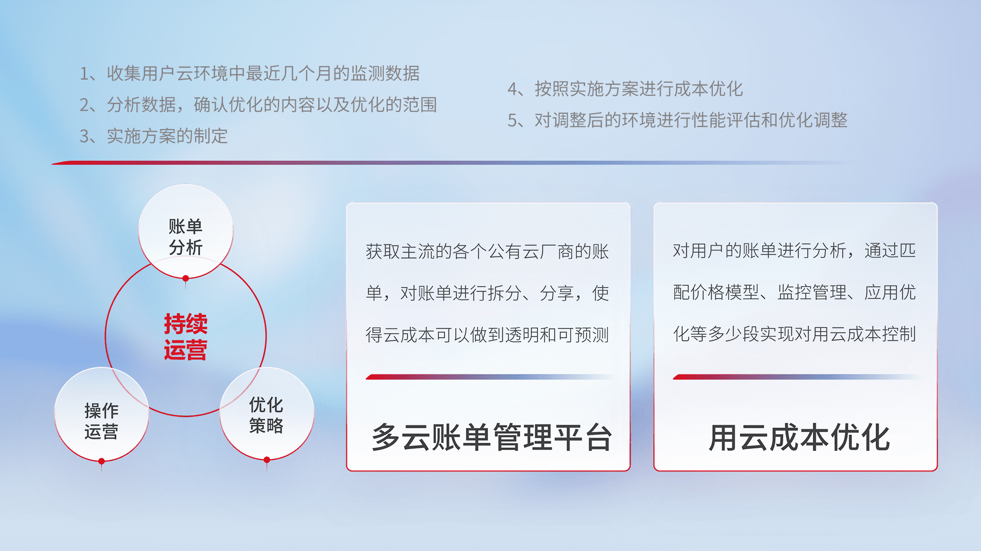 通过多云纳管,,,,以统一的资源数据模型把客户的云资源进行抽象和封装,,,,进而实现对多云资源的统一操作,,,,保障云资源管理的可靠性、、、稳定性与可用性。。。。量身定制化运维内容,,,,配置、、开发运维、、补丁管理、、、备份、、监控、、、、认证和访问管理、、、审计和日常巡检等,,,保障在用云过程中的可靠度,,,稳定度以及高可用率。。。